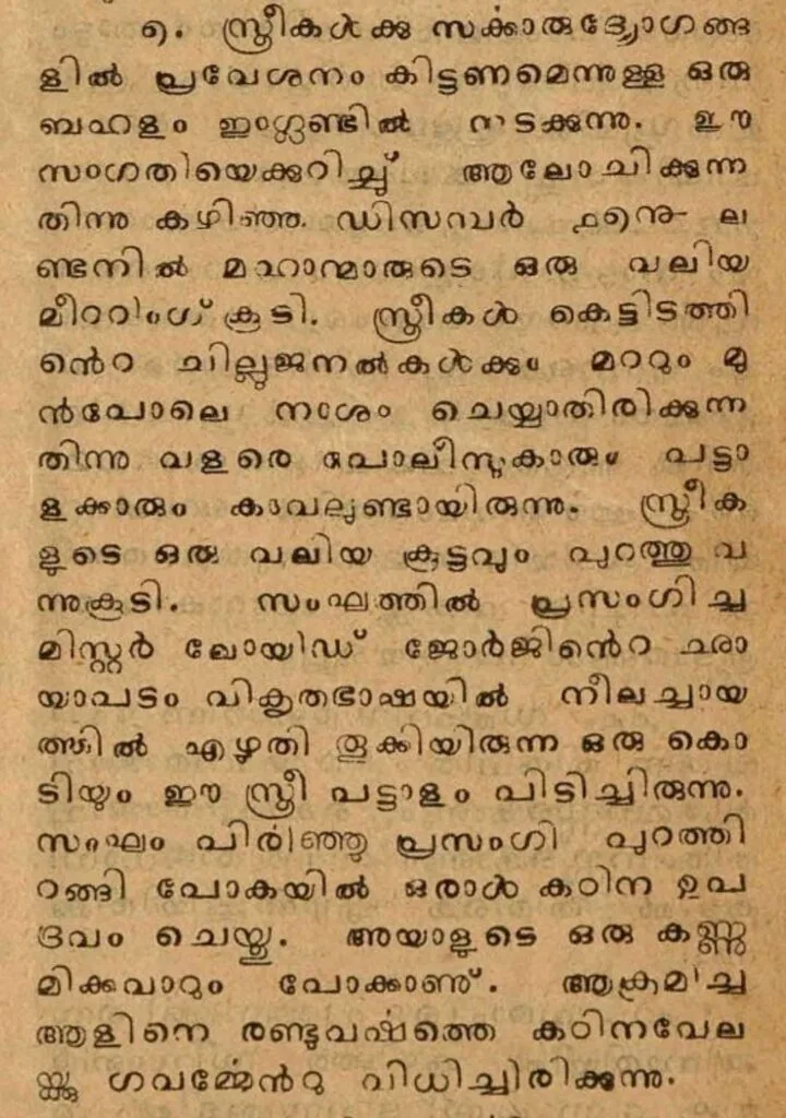 സ്ത്രീകൾക്ക് സര്ക്കാര് ഉദ്യോഗം വേണമെന്ന് ആവശ്യപ്പെട്ടുള്ള ഒരു പ്രക്ഷോഭം. ബ്രിട്ടനിലെ പ്രധാനമന്ത്രി ആയിരുന്ന ലോയിഡ് ജോർജ് വരെ സ്ത്രീകളുടെ രോഷത്തിന് പാത്രമായി. അക്രമാസ്തമായ സമരം വരെ നടത്തണമെങ്കിൽ സ്ത്രീകളുടെ വികാരം എത്ര ശക്തമായിരുന്നു എന്ന് മനസിലാക്കാം. സ്ത്രീകൾക്ക് ജോലി നൽകുന്നത് എതിർക്കാനും ആളുണ്ടായി. ഒരാളുടെ കണ്ണ് തകർത്തയാളിനെ രണ്ടു വർഷം തടവിന് ശിക്ഷിച്ചു എന്നും വാർത്തയിലുണ്ട്.
