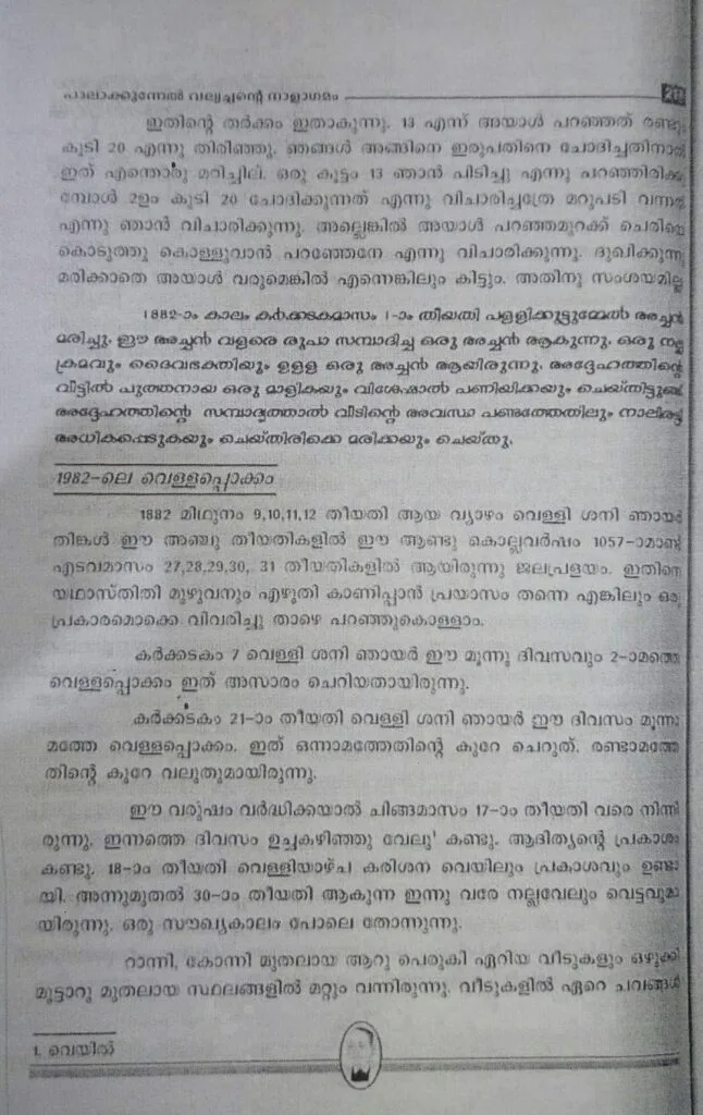 വയനാട്ടിലെ പ്രളയത്തിൽ ഒരു സ്ത്രീയും കുട്ടികളും ഒരു ആനക്കൂട്ടത്തിൻ്റെ ഒപ്പം രാത്രി ചിലവിട്ട സംഭവം അവിശ്വസനീയം എന്നാണ് പലരും കരുതുന്നത്. എന്നാൽ 140 വര്ഷം മുൻപ് പ്രളയസമയത്ത് ഒരു മരക്കൊമ്പിൽ ഒരു സ്ത്രീയും ഒരു വിഷസർപ്പവും ഒന്നിച്ച് കഴിഞ്ഞു എന്ന് വല്യച്ഛൻ എഴുതിയിട്ടുണ്ട്.